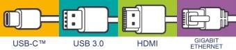 1 x USB-C (USB 3.1 GEN 1), 2 x USB 3.0, 1 x HDMI 4K (30Hz), 1 x Gigabit Ethernet
