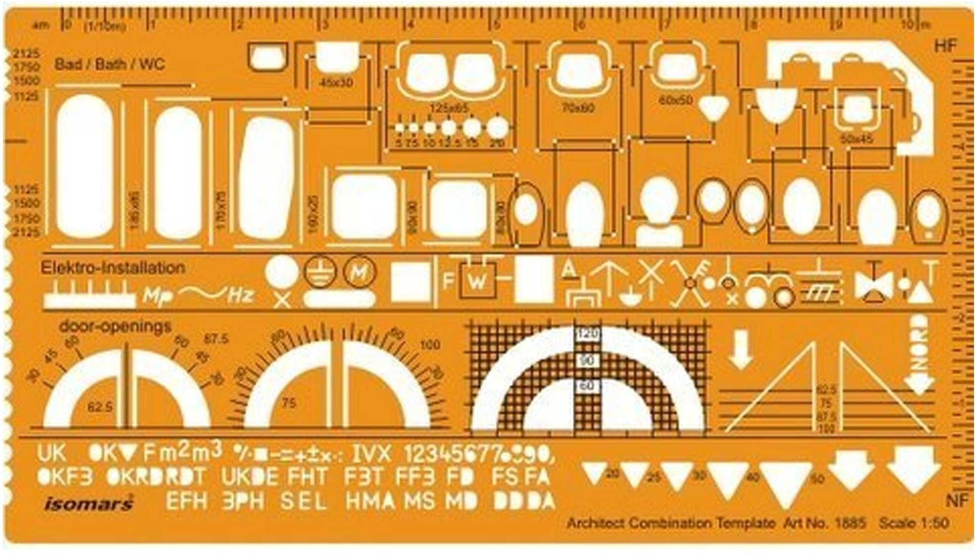 Isomars Architectural Drafting Template StencilContains symbols of bathroom sinks, showers, toilets, electrical installations, door openings and other elements of domestic design.Useful when sketching, drafting, marking-up design layouts for bathrooms, kitchens and living areas.Isomars Templates contain precision-milled shapes and provide complete accuracy and symmetry.Made from transparent, orange plastic. The rate of transparency allows you to see the drawing medium below template for easy positioning.