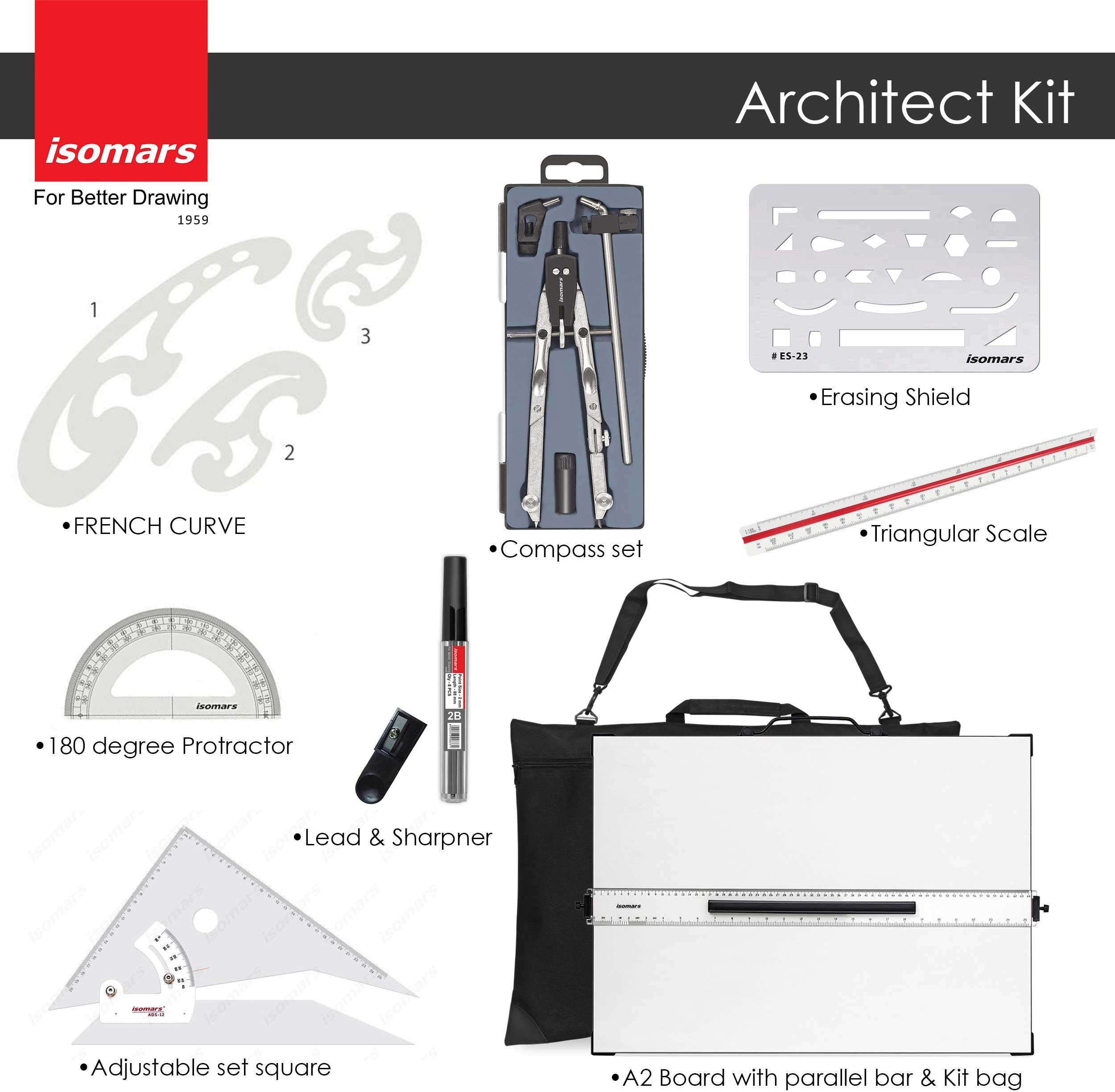 Wooden - both side laminated board15° working anglesCarry HandleFitted with Parallel motionadjustable set square (25 cm)Protractor 180°French Curve set of 3Triangular Scale 12inch2mm lead sharpenerLead tube with 10 leads (2mm)Compass SetErasing ShieldDurable Kit bag