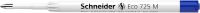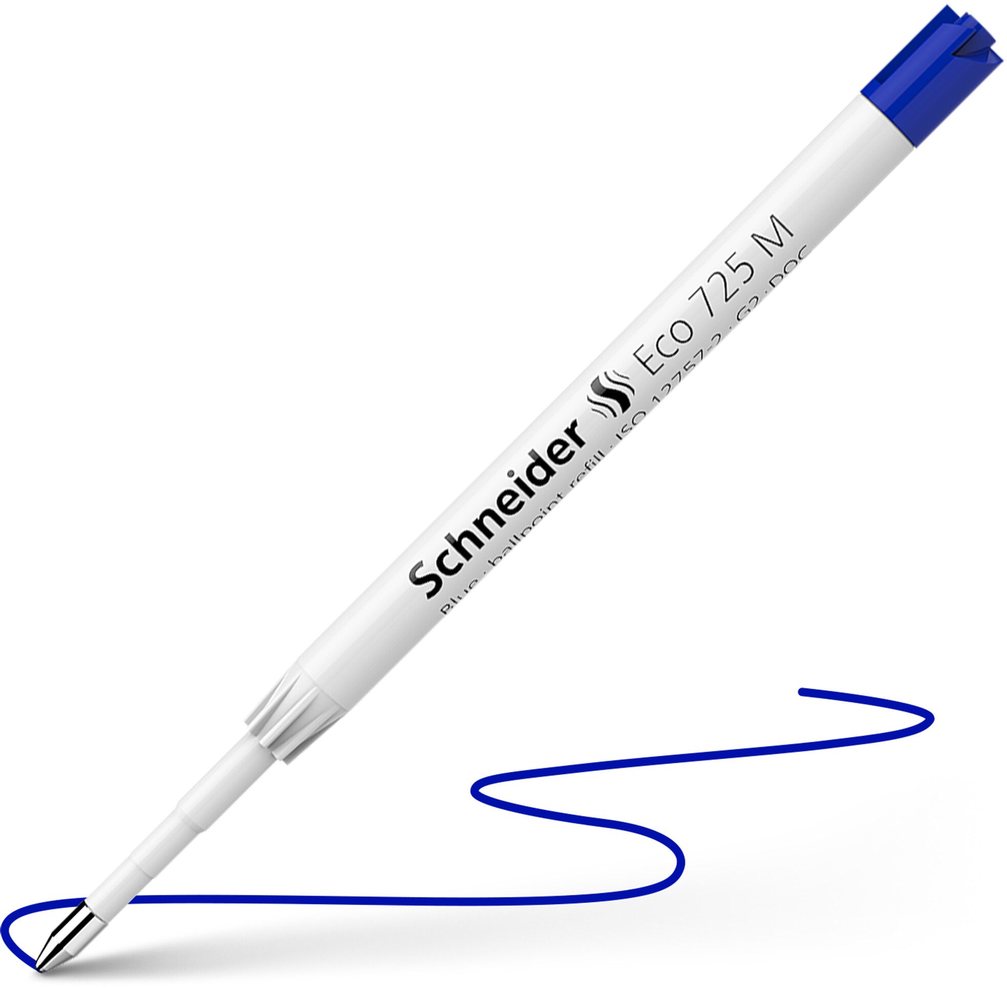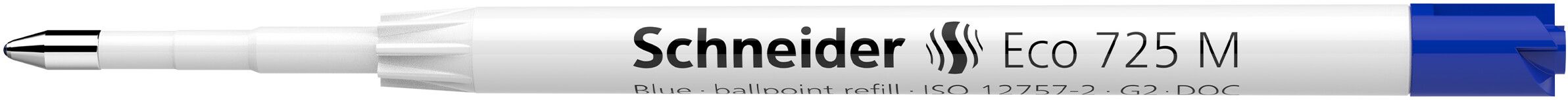 Giant refill in ISO format G2 with *refill body made of 95 % recycled plastic, saving more than 70% CO2 emissions compared to conventional plastic. Waterproof according to ISO 12757-2, line width in medium (M). Writing colour blue. Certified with the eco-label "Blue Angel" suitable as refill for the Reco ballpoint pen and all Schneider ballpoint pens with Plug+Play system as well as many other brands. Due to the pleasantly light and constant ink flow, Eco 725 ensures a clean and comfortable writing. The wear-resistant stainless steel tip guarantees that the large ink supply can be fully used and does not smear.