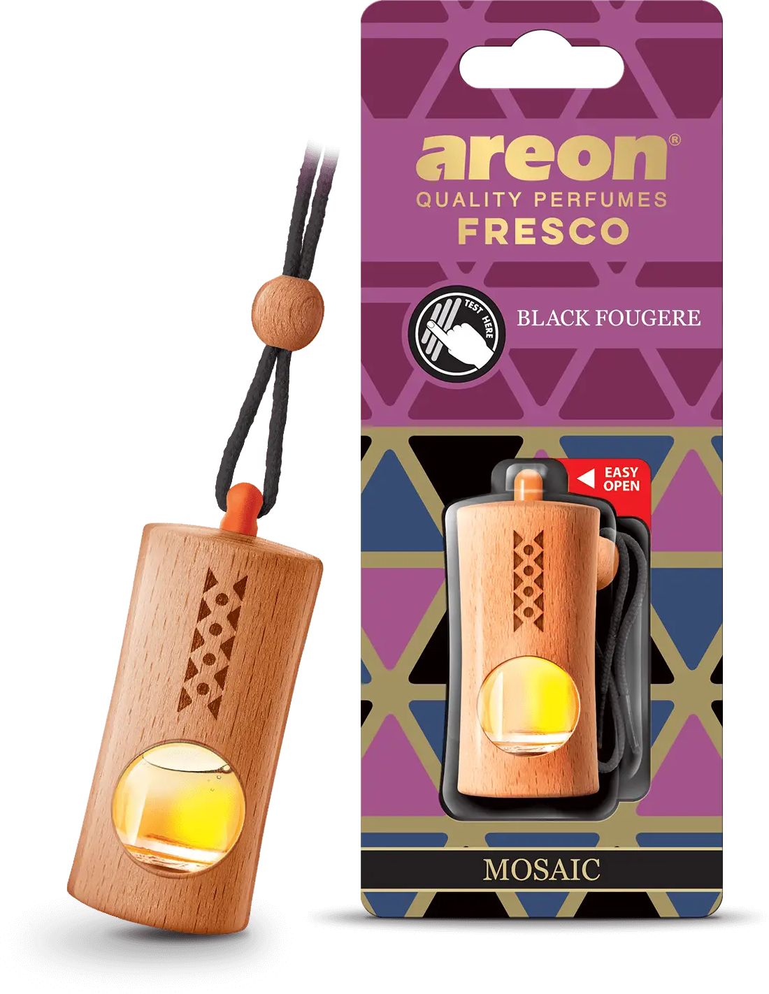 Areon Fresco Mosaic car air freshener, combining a sophisticated wooden design and powerful fragrance with a mosaic style.