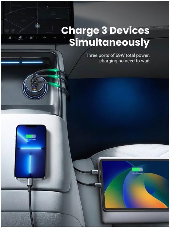 Car charger, UGREEN EC703 (35024), 75 W, Type-C, USB-A, gray.