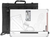 Wooden - both side laminated board15° working anglesCarry HandleFitted with Parallel motionset square 45° (25cm)set square 30° (30cm)Protractor 180°French Curve set of 3Triangular Scale 12inch2mm lead sharpenerLead tube with 10 leads (2mm)Compass SetErasing ShieldDurable Kit bag