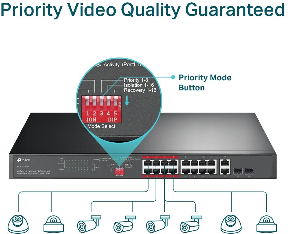 Priority mode for ports 1–8 to guarantees the quality of sensitive applications like video monitor.