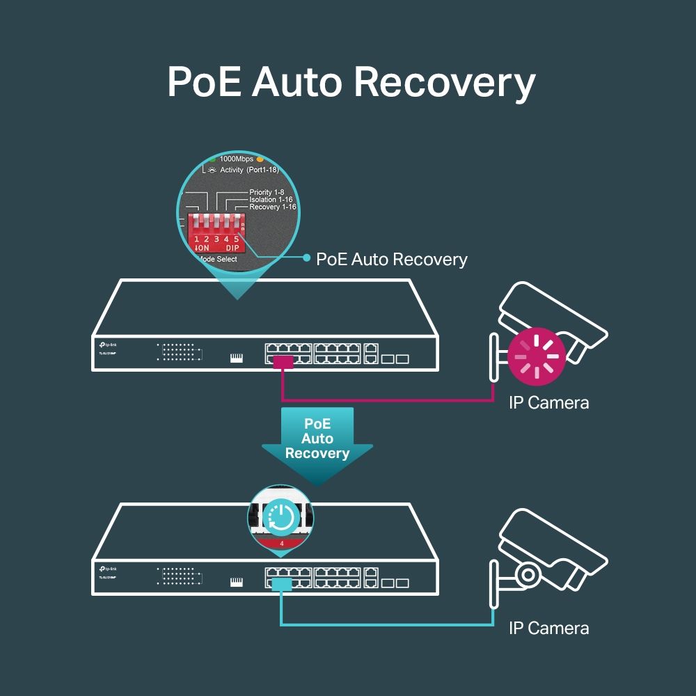 PoE Auto Recovery guarantees stable operation of PoE devices by automatically rebooting the dropped or unresponsive PD devices.