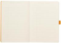 - Italian leatherette glued spine with embossed Rhodia logo- 124 non-micro-perforated sheets- 90 g brushed ivory vellum Clairefontaine paper- 224 numbered sheets- 6 page index- 2 perpetual calendars- 2 ribbon bookmarks- expanding inner pocket- secured by elastic- flat opening at 180°Size: 14.8x21cmPaper density: 90gsmPaper size: A5120 sheets