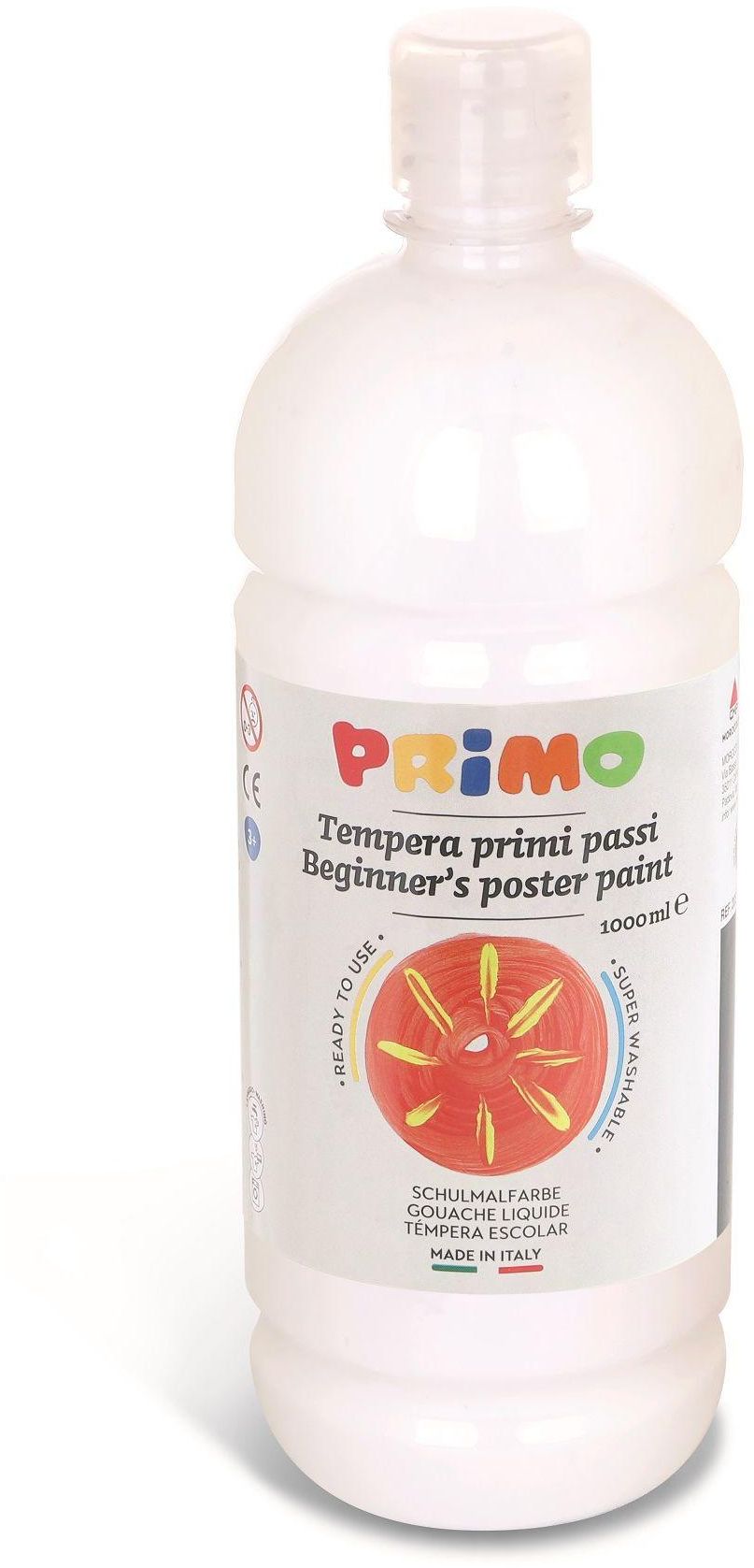 PRIMO Gouache Paint 1000ml is a high-quality, water-based tempera paint, presented in a generous 1000ml bottle with a flow-control cap. Known for its rich pigmentation and smooth consistency, this gouache offers excellent coverage, brightness, and intensity. It applies effortlessly with a brush, and once dry, colors remain vivid and bright with a beautiful matte finish. Adhering to a variety of surfaces including paper, cardboard, wood, textiles, glass, terracotta, metal, and plastic, it's perfect for a wide range of creative and educational projects. New tones can be easily achieved by mixing the colors together. When perfectly dry, it does not scratch, even when applied in multiple layers, and can be reactivated with water, offering flexibility for corrections and blending. While using, clothes and work surfaces should be covered, and stains should be removed immediately following provided instructions. Remember to remove the safety under-cap before use.