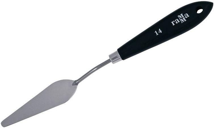 A soldered stainless steel palette knife with a comfortable, flat handle made of natural beech wood. The welded connection between the handle and blade allows for a greater angle of the palette knife to the canvas, reducing the chance of accidental contact and smudging the paint.
