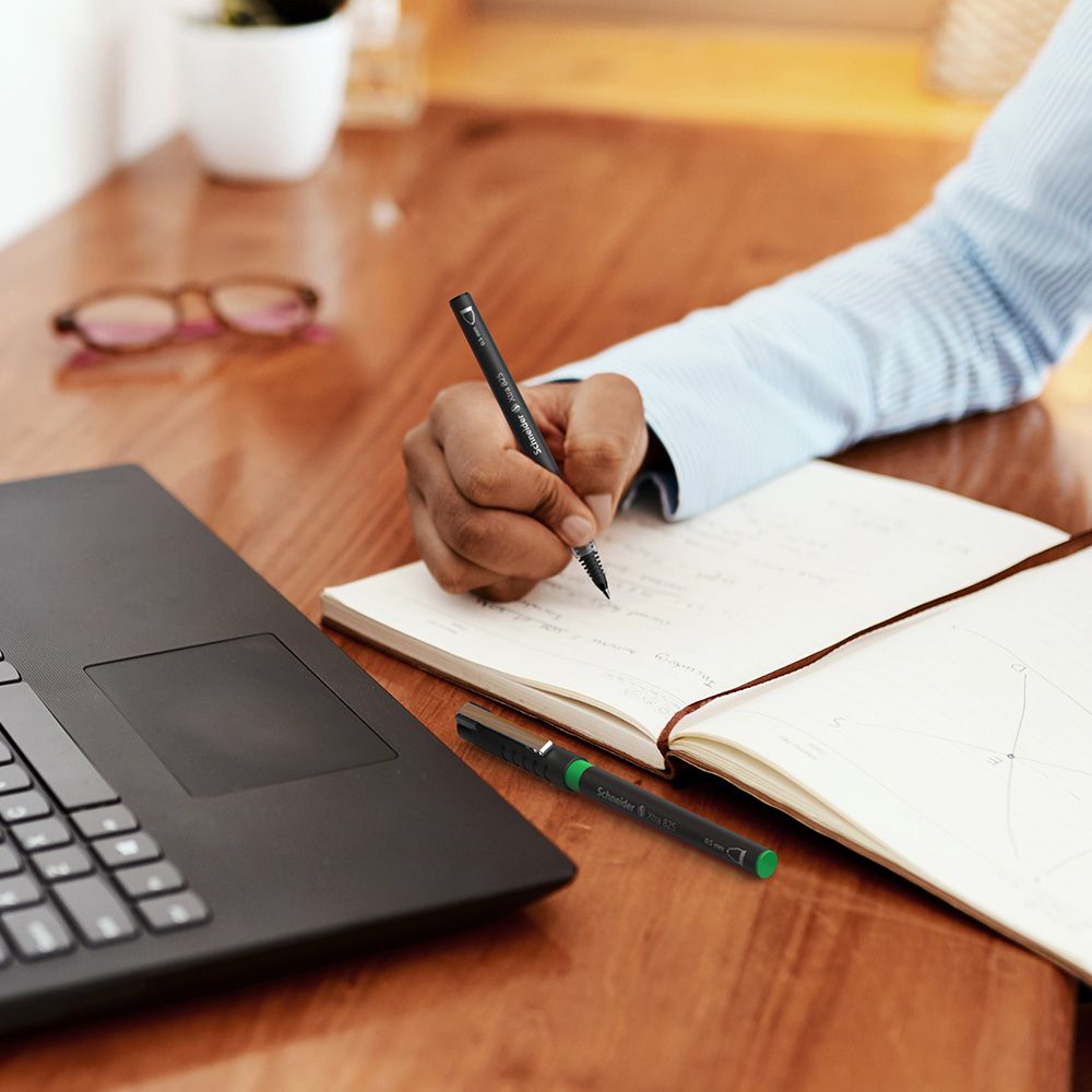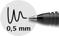 Rollerball with innovative Liquid-Ink technology and wear-resistant stainless steel tube tip, line width approx. 0.5 mm. An ink regulator controls the ink flow exactly and consistently from beginning to end, without blots or skips. The large ink reservoir has a level indicator and every drop of ink is used. The cap-off ink does not run dry even if the cap is removed for 2-3 days. The cap has a sturdy metal clip and fits neatly on the end of the barrel.