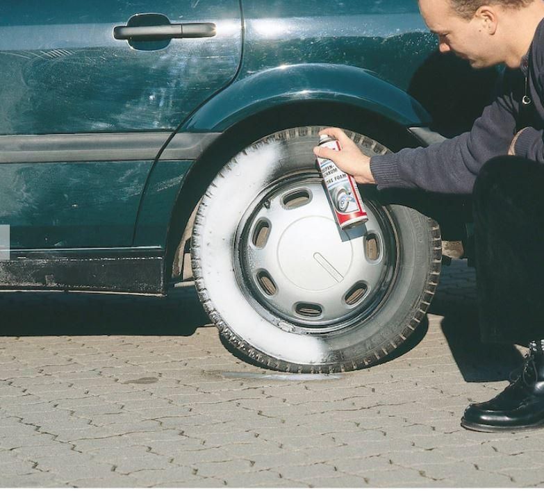 Do not spray on tyre treads, brake discs and brake drums. Contains silicone.