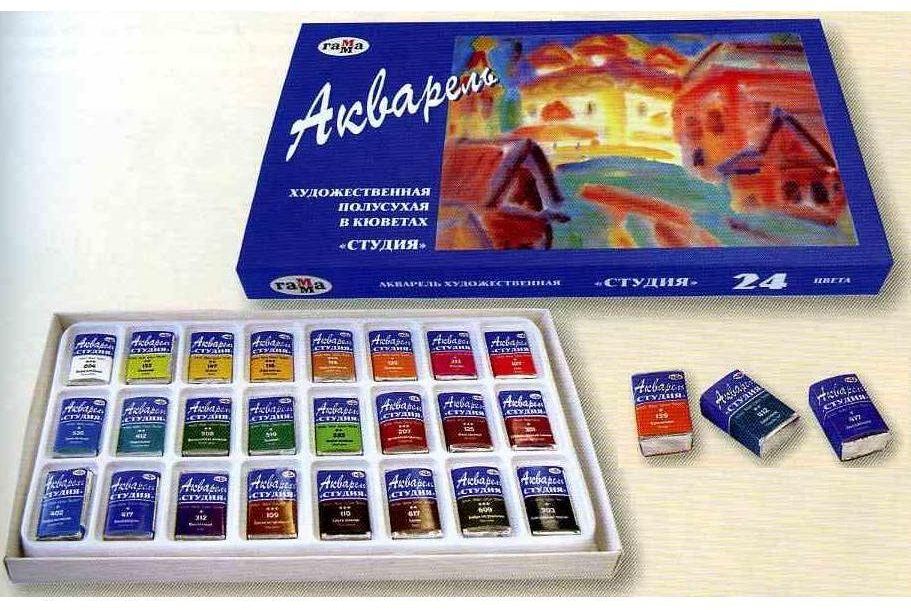 აკვარელის საღებავები "სტუდია" დამზადებულია გუმიარაბიკის საფუძველზე. ნახევრადმშრალი აკვარელი შრება არაუმეტეს 40 °C ტემპერატურაზე, რაც ინარჩუნებს საღებავის სიკაშკაშეს და სიახლეს. გაშრობის შემდეგ ის მქრქალი ხდება. ფერები ადვილად ერევა ერთმანეთს, კარგად იშლება და ადვილად გროვდება ქუვეტიდან. 24 ფერის აკვარელის საღებავების ეს ნაკრები იდეალურია დამწყები მხატვრებისა და სამხატვრო სასწავლებლების სტუდენტებისთვის. ქუვეტის მოცულობაა 2,6 მლ.