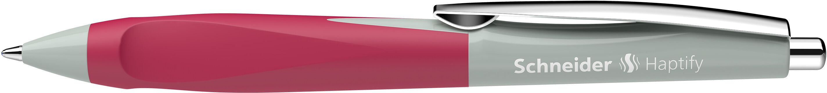 Ballpoint pen with ergonomically rubberised three-sized grip for ideal positioning in the hand. Replaceable metal refill Express 775 Medium (M) for extraordinarily easy and gliding writing. Barrel colour coral, writing colour blue, waterproof according to ink standard ISO 12757-2. The wear-resistant stainless steel tip guarantees that the large ink supply can be fully used and does not smear. The Haptify has a strong metal clip and, thanks to the clever Plug+Play system, can use a variety of refill formats.
