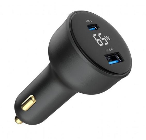 2-პორტიანი შავი USB სწრაფი დამტენი Gembird TA-UC-AC2PD65LCD-CAR-01