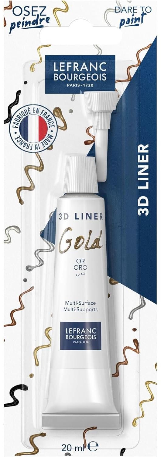 Precise 3D Acrylic Liner - Acrylic paint with perfect texture for real 3D effects, equipped with an ultra-fine nozzle for precise lines, reliefs and detailed embellishments.High-quality acrylic paint - water-based, permanent 3D effect paint - opaque, non-fading, waterproof and quick-drying - ideal for creative art and DIY projects.Versatile Application - 3D liner for canvas, acrylic paper, wood, glass, ceramic, terracotta - ideal for relief decorations, decorative accessories, cards or gift wrapping.Easy to use - Soft 20 ml tube with precision tip for precise lines and controlled application - perfect for fine details or large designs.Made in France - 3D acrylic liner in 6 brilliant colours (silver, gold, black, pearl white, antique gold, copper) - made in France to the highest quality standards.