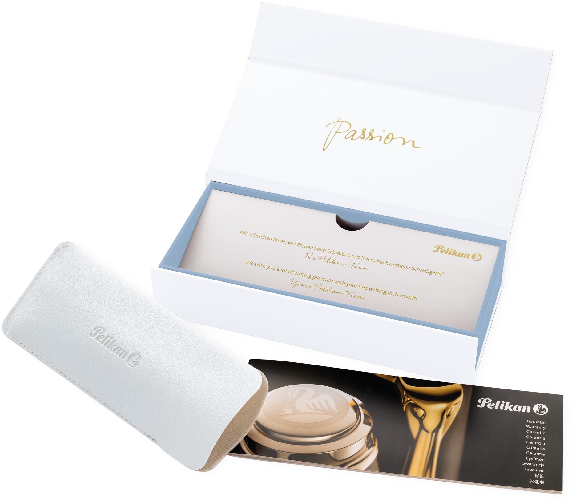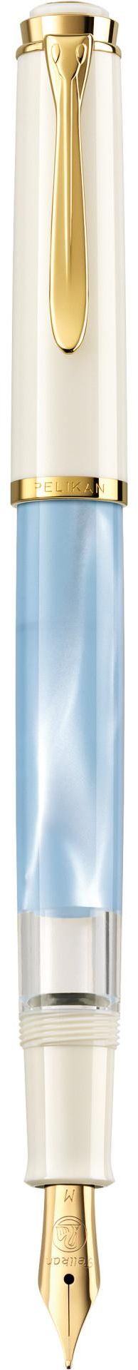 High-quality piston fountain pen; With gold-plated decorative elements; With pearl effect for a velvety color impression; With 24-carat gold-plated stainless steel nib; Particularly soft writing feel; With ink viewing window; With practical clip; Nib: M; Color: Pastel-Blue; Made in Germany