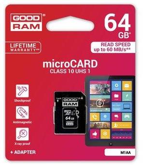 მეხსიერება M1AA-0640R12; 64GB MICRO CARD class 10 UHS I + adapter GOODRAM
