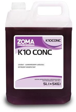 Zoma K10 CONC არის კვების ობიექტებში წყალგამძლე ზედაპირების სარეცხი-სადეზინფექციო საშუალება, რომელიც ერთდროულად წმენდს და ახდენს დეზინფექციას ყველა წყალგამძლე ზედაპირებზე და მოწყობილობებზე. მეოთხეული ამონიუმის შემცველობით მეტად ეფექტურია მიკროორგანიზმების ფართო სპექტრის წინააღმდეგ საბრძოლველად. პროდუქტი ასევე შეიცავს ზედაპირულად აქტიურ ნივთიერებებს, რის გამოც პროდუქტი გამოიყენება ერთდროულად როგორც გაწმენდის, ასევე დეზინფექციისთვის.