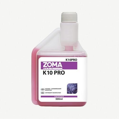 Zoma K10 Pro არის კვების ობიექტებში წყალგამძლე ზედაპირების სარეცხი-სადეზინფექციო საშუალება, რომელიც ერთდროულად წმენდს და ახდენს დეზინფექციას ყველა წყალგამძლე ზედაპირებზე და მოწყობილობებზე. მეოთხეული ამონიუმის შემცველობით მეტად ეფექტურია მიკროორგანიზმების ფართო სპექტრის წინააღმდეგ საბრძოლველად. პროდუქტი ასევე შეიცავს ზედაპირულად აქტიურ ნივთიერებებს, რის გამოც პროდუქტი გამოიყენება ერთდროულად როგორც გაწმენდის, ასევე დეზინფექციისთვის.